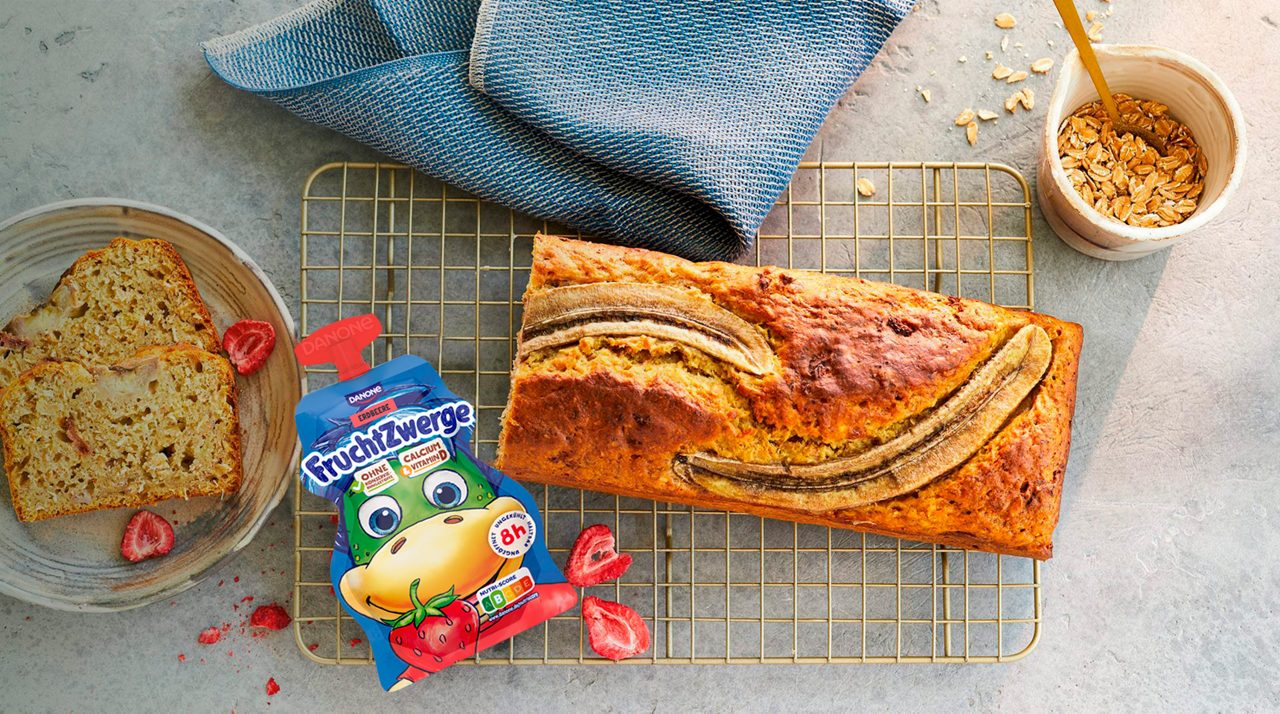 Den Backofen auf 180°C Ober- und Unterhitze vorheizen. Eine Kastenform (30 cm) mit Backpapier auslegen. 3 reife Bananen mit einer Gabel zu Püree zerdrücken und mit den restlichen Zutaten wie Mehl, Backpulver, Honig & Co zu einem Teig verrühren. Nach Bedarf noch etwas Milch hinzufügen.